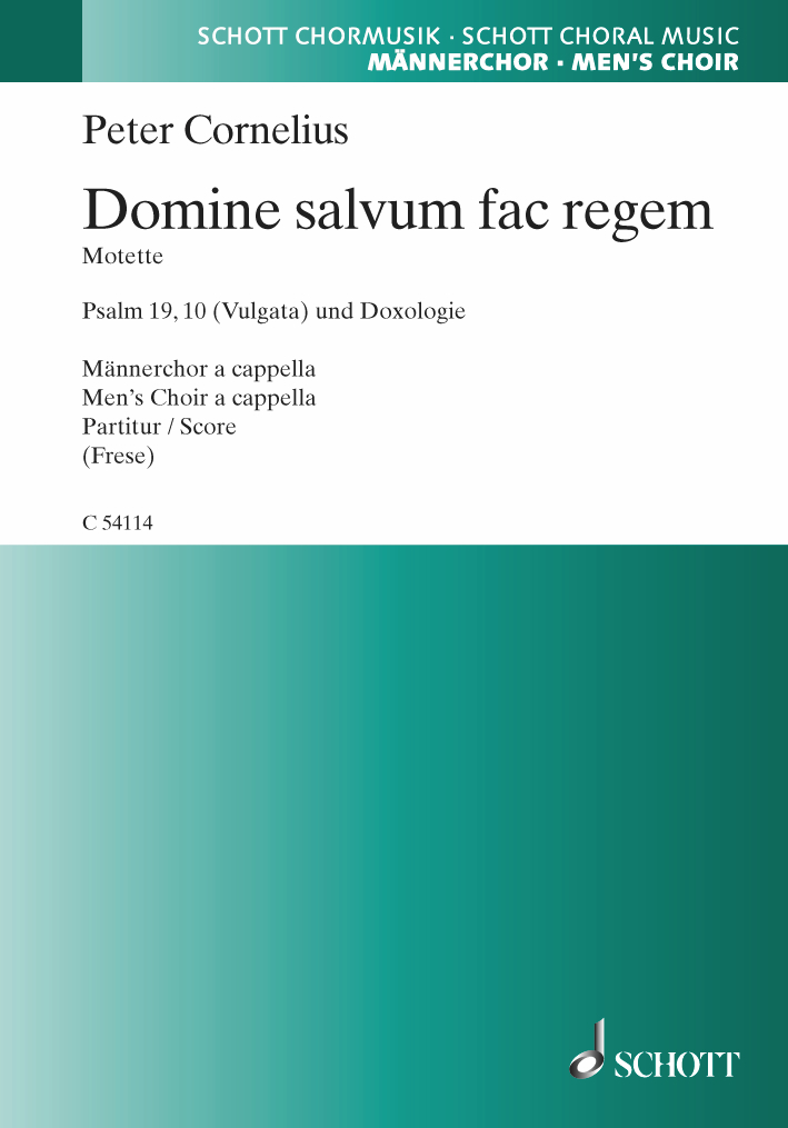 Auch das „Domine salvum fac regem“ komponierte Cornelius in diesem Zusammenhang – in zwei Fassungen: für Männerchor a cappella und für Tenor-Solo, gemischten Chor und Orchester. Die Männerchor-Fassung entstand im Mai 1852. Sie vertont „sprechend“ und expressiv die Textzusammenstellung aus Psalm und Doxologie, mit bewegt-motettischen wie blockhaften Abschnitten und einem wie gemeißelt gesetzten „Gloria Deo“, das den Schlussabschnitt einleitet – ein beeindruckendes Werk.